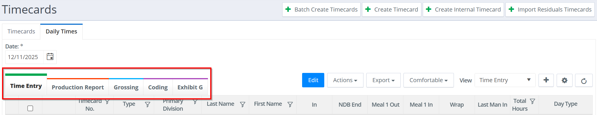 The "Daily Times" grid will display the list of timecards for the date shown in the top-left corner of the page. The grid defaults to today’s date to streamline time entry. If the grid is empty, it means there are no timecards for the selected date. You can create new timecards using the Create Timecard or Batch Create Timecard actions.