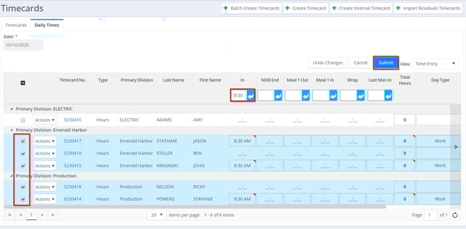 To edit multiple fields across different timecards simultaneously: