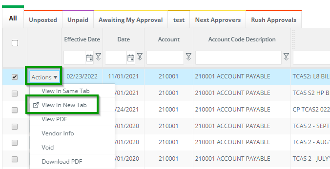 Step 2: On the desired transaction, click ACTIONS and then VIEW IN NEW TAB.