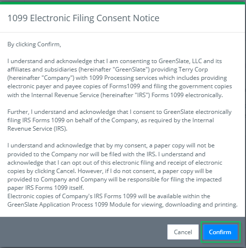Step 11: Review the 1099 Electronic Filing Consent Notice, then click “Confirm.”