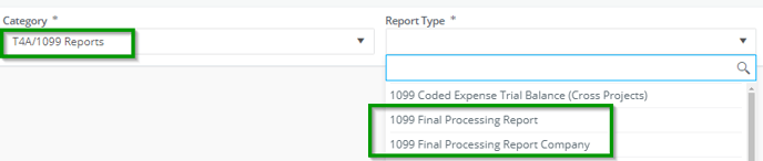 Step 2: Select the “T4A/1099 Reports” report category, and “1099 Final Processing Report” or “1099 Final Processing Report Company.”