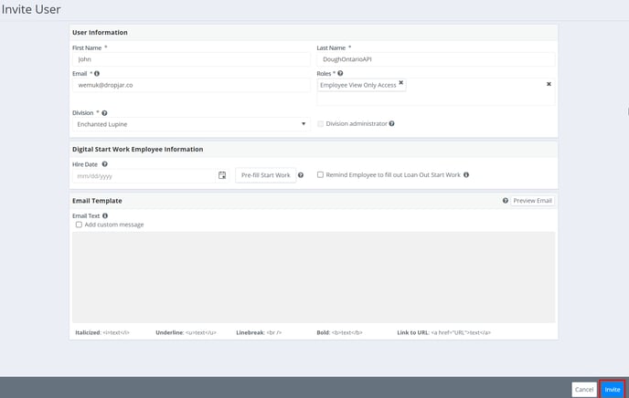 Step 11: Close the start work packet window and click "Invite" on the "Invite User" window.